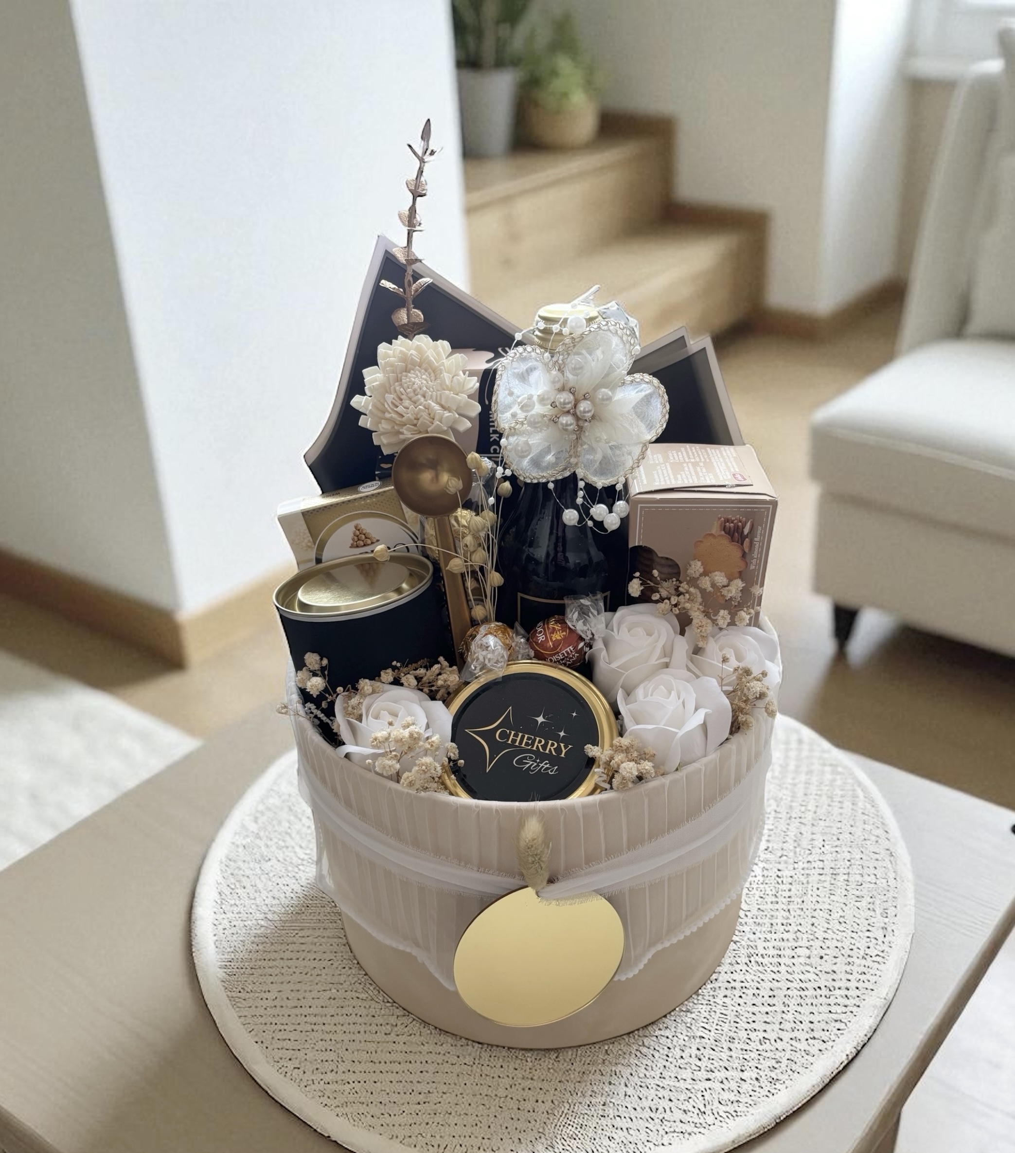 - welurowy box premium w kolorze kremowym o średnicy 25 cm ozdobiony tiulowym wykończeniem, ekologiczne wypełnienie, szyfonowa wstążka