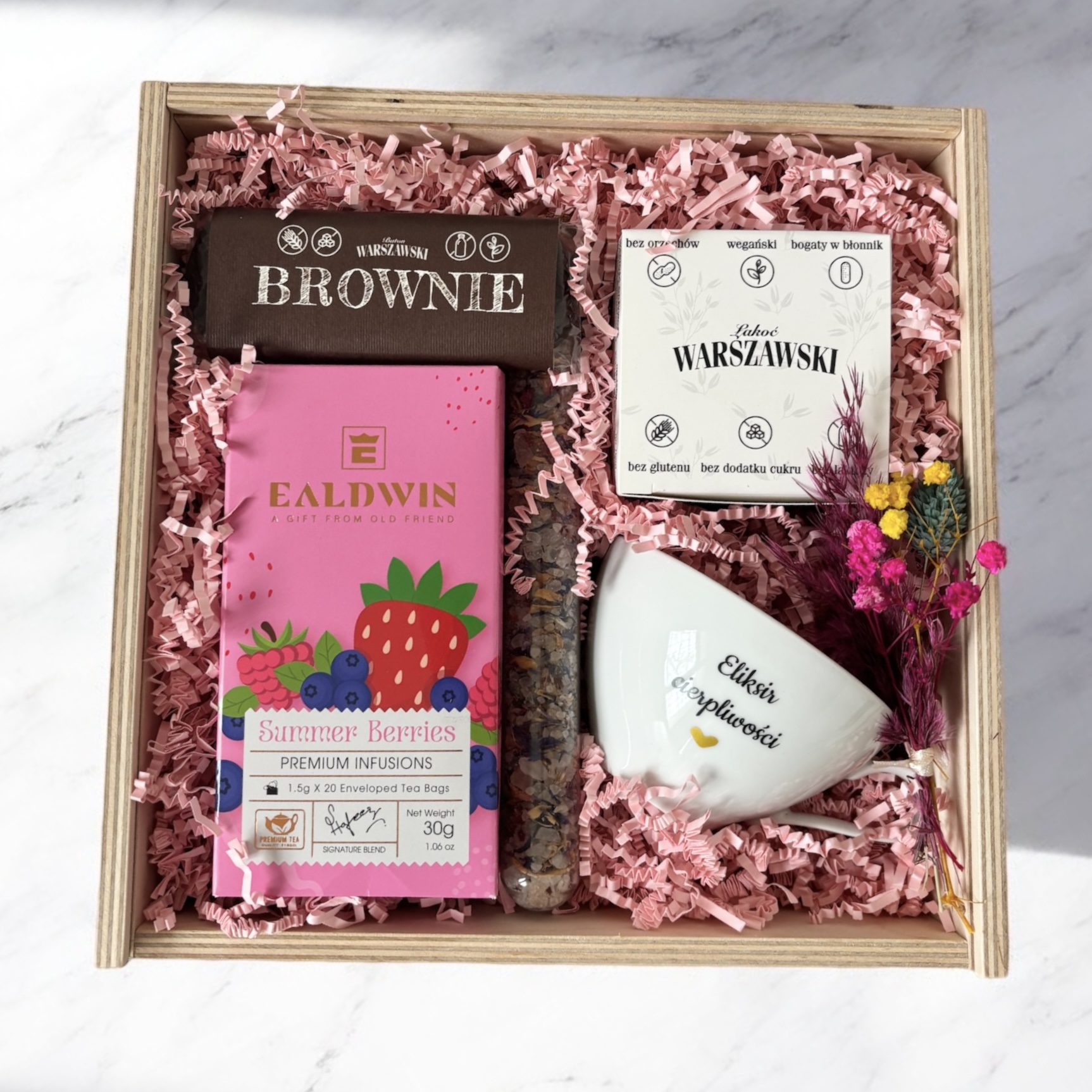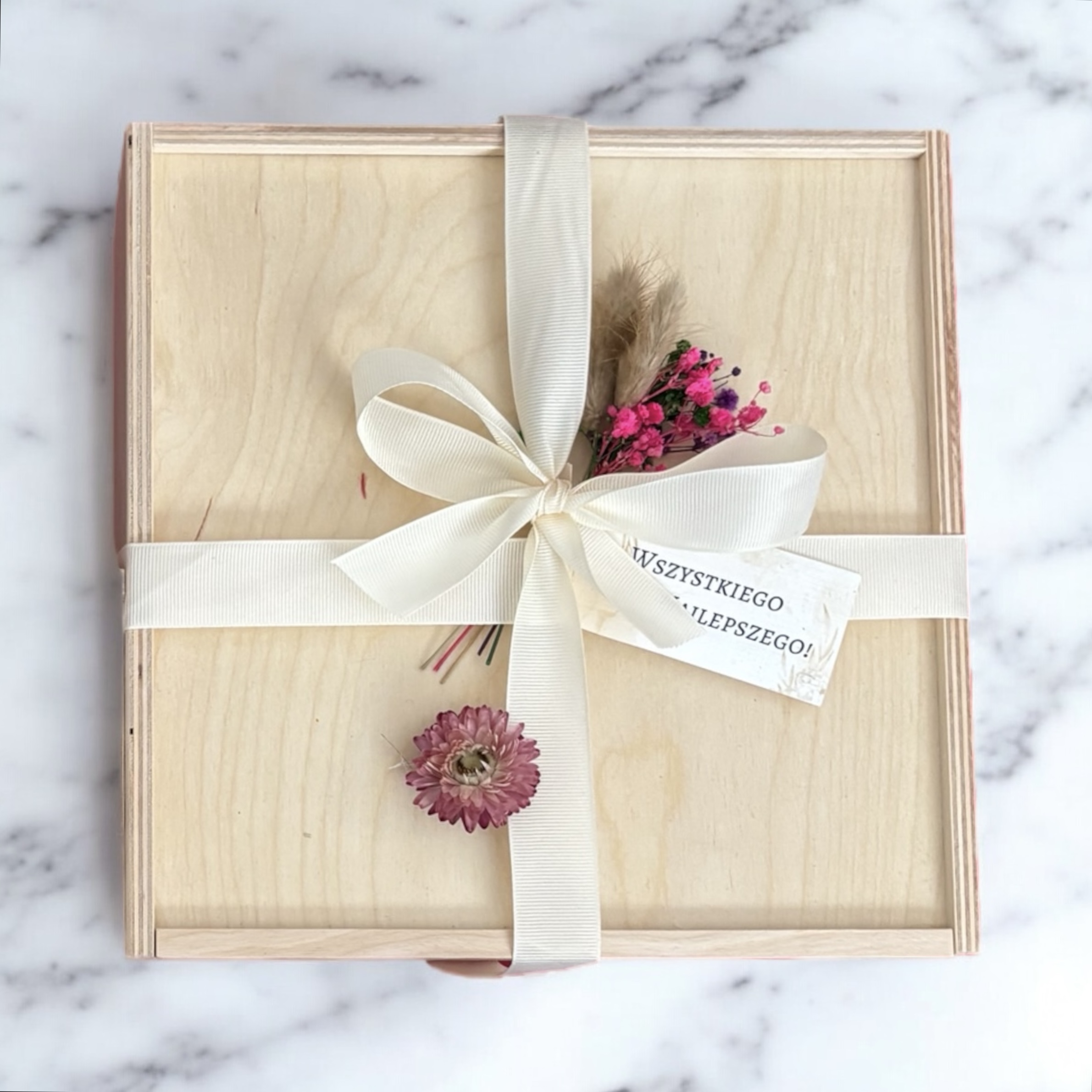 - drewniany box premium o wymiarach 25x25cm, ekologiczne wypełnienie, dodatki dekoracyjne, takie jak suszone kwiaty, które podkreślają naturalny charakter zestawu