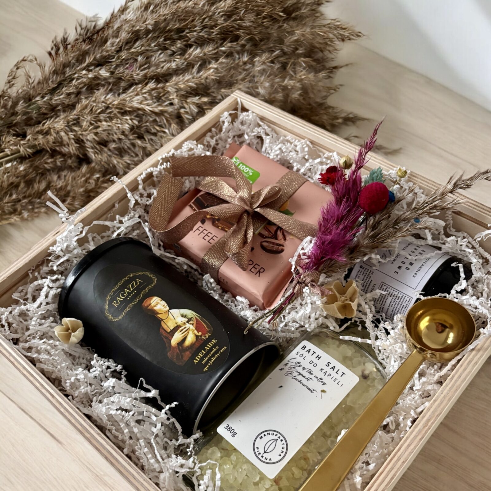- drewniany box premium o wymiarach 25x25cm, ekologiczne wypełnienie, dodatki dekoracyjne, takie jak suszone kwiaty, które podkreślają naturalny charakter zestawu