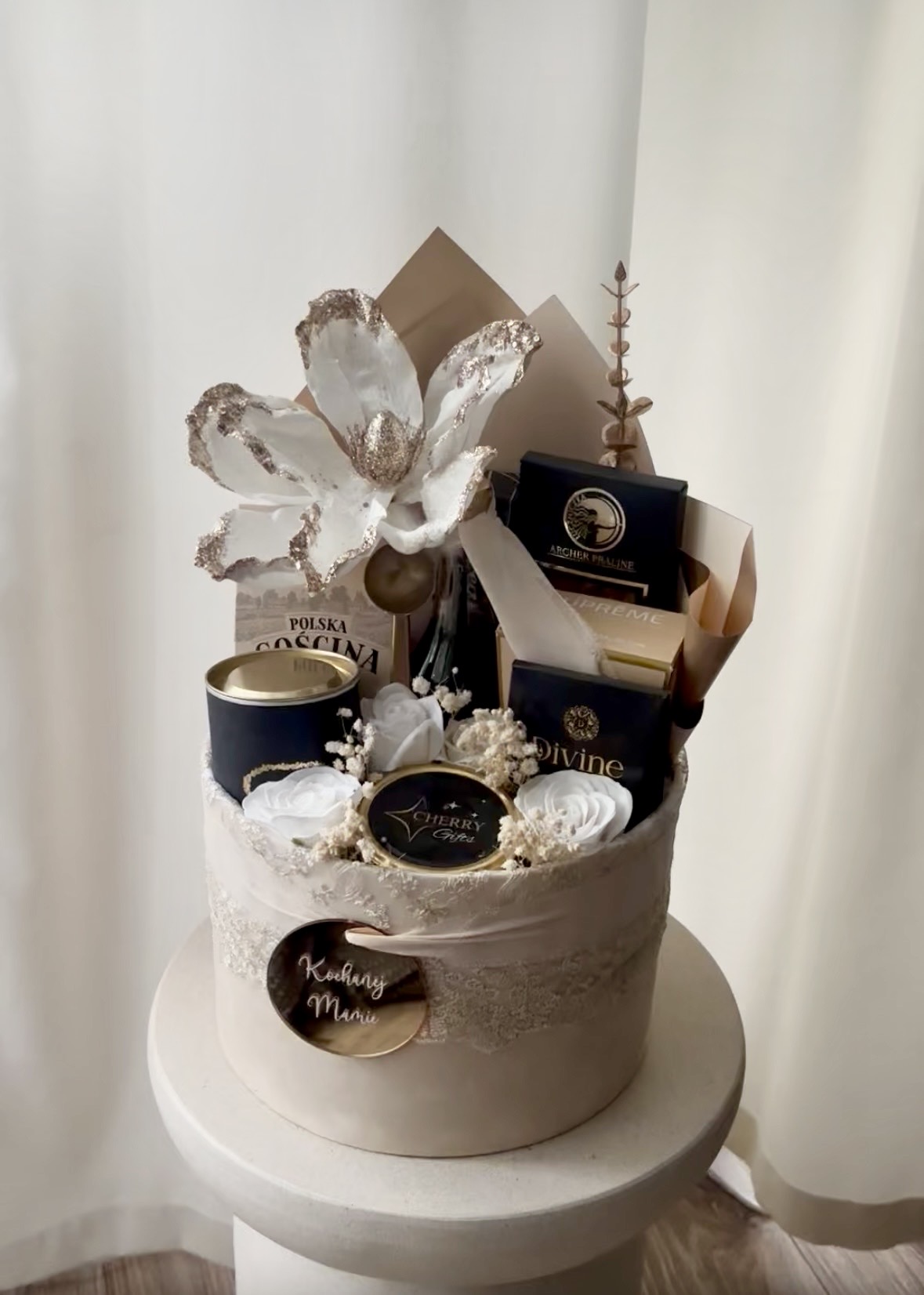 - welurowy box premium w kolorze kremowym o średnicy 25 cm ozdobiony koronkowym wykończeniem, ekologiczne wypełnienie, szyfonowa wstążka