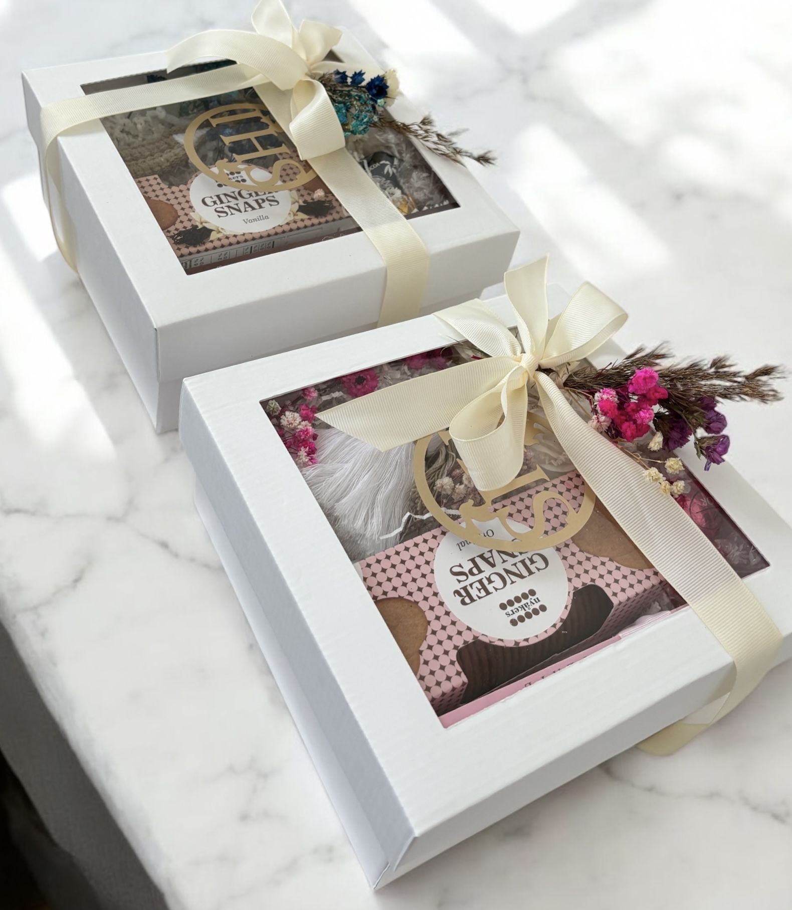 - pudełko o wymiarach 20x20x10 od polskiego producenta, ekologiczne wiórki ozdobne, ozdoby kwiatowe (suszone i sztuczne) satynowa wstążka
