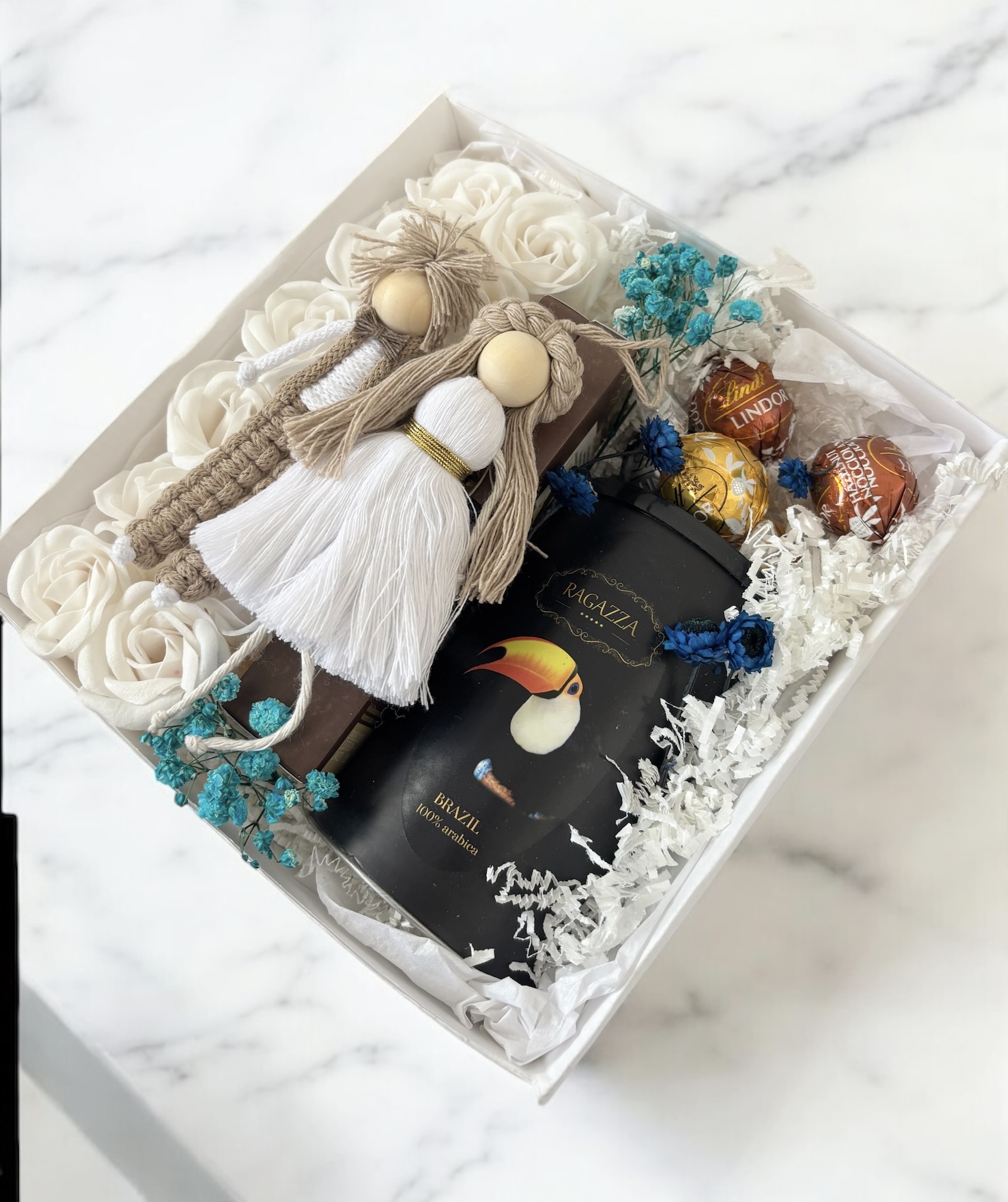 - pudełko o wymiarach 20x20x10 od polskiego producenta, ekologiczne wiórki ozdobne, ozdoby kwiatowe (suszone i sztuczne) satynowa wstążka