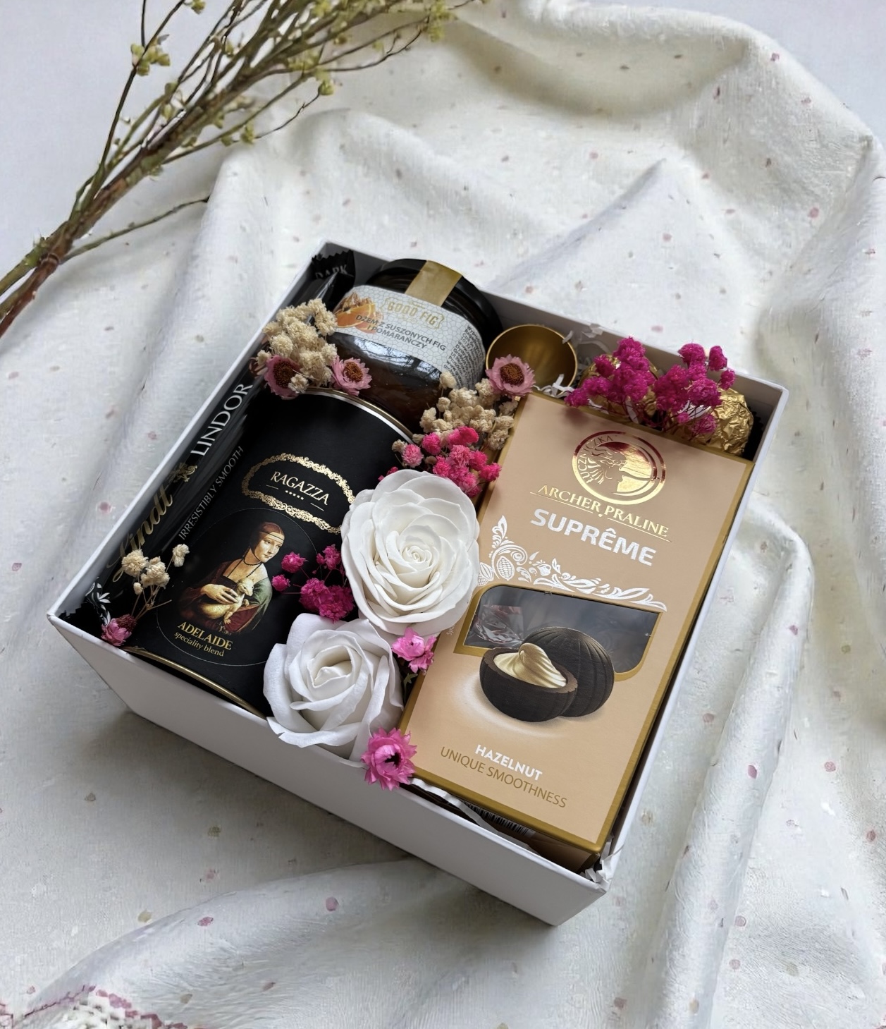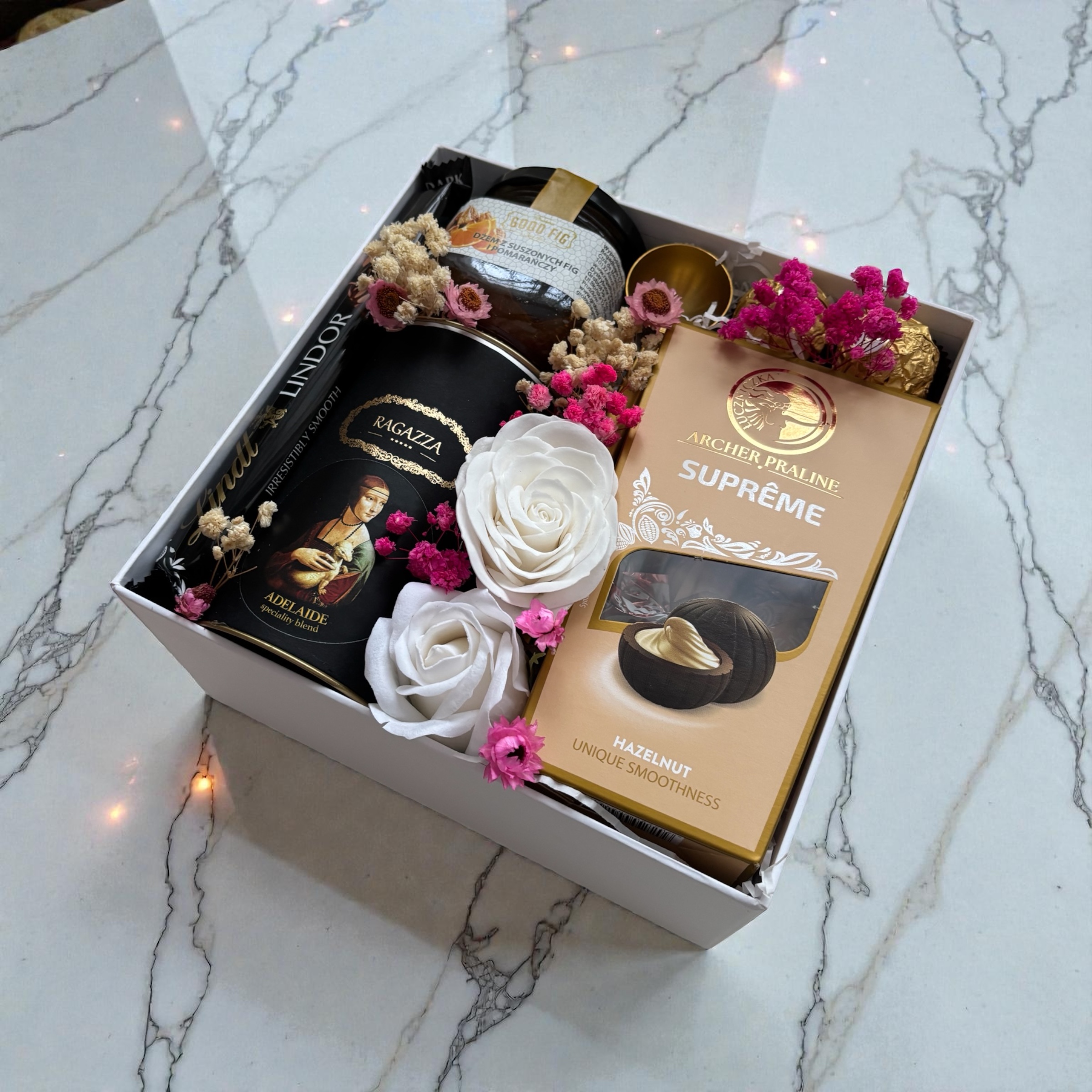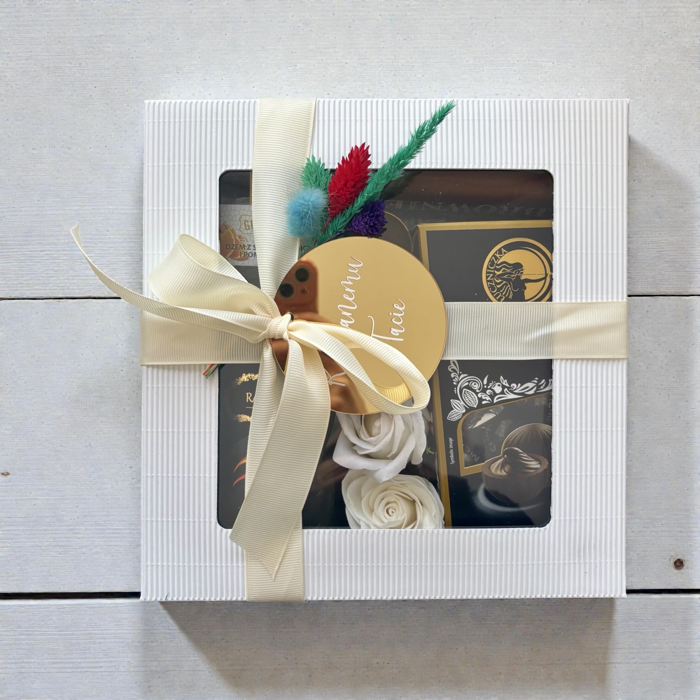 - box premium w kolorze białym o wymiarach: 21x21x11 cm ozdobiony suszonym bukietem, ekologiczne wypełnienie, ozdobna wstążka w kolorze kremowym