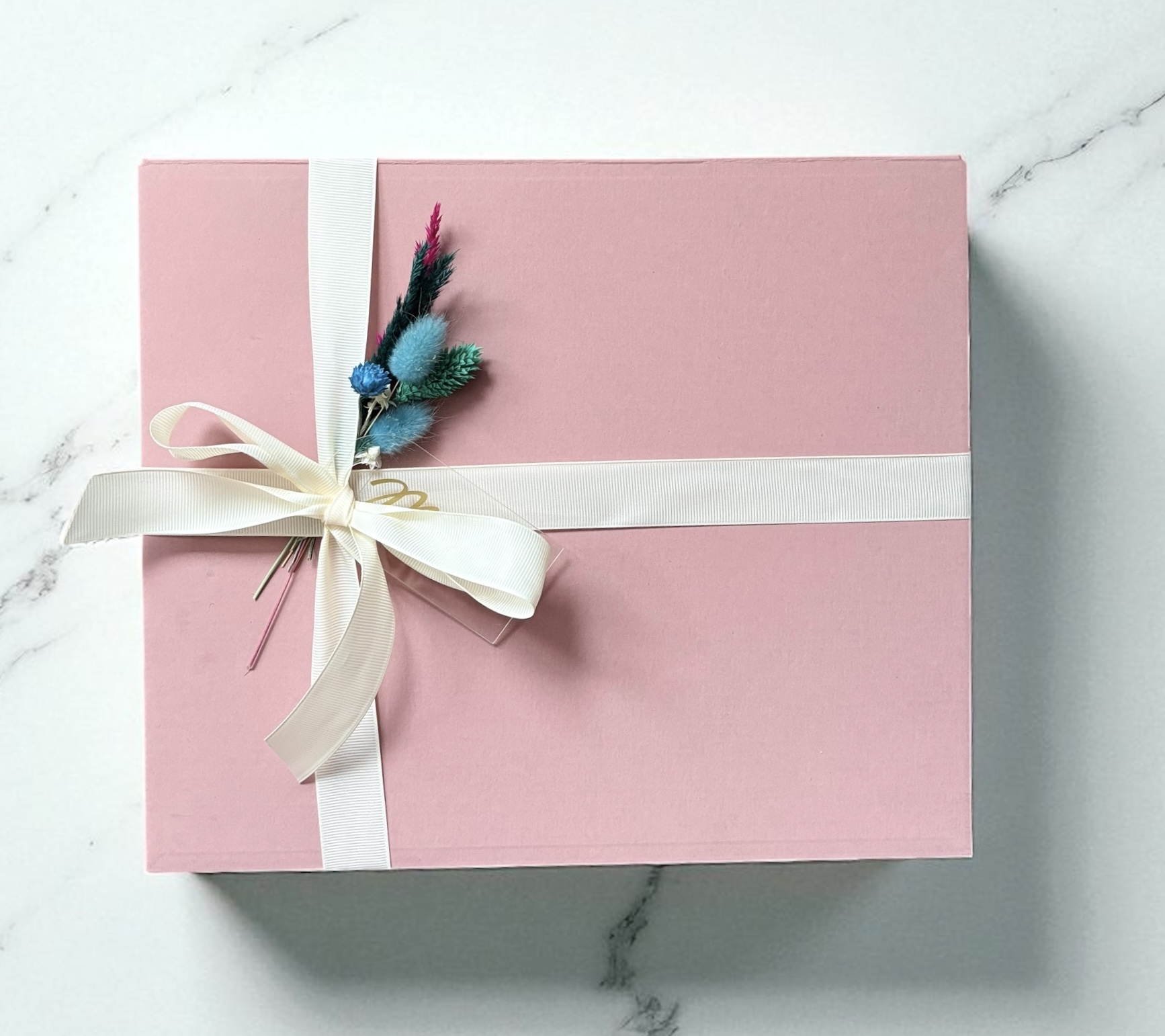 - pudełko premium max o wymiarach 300x250x110cm w kolorze różowym, przewiązane satynową wstążką, suszony bukiet
