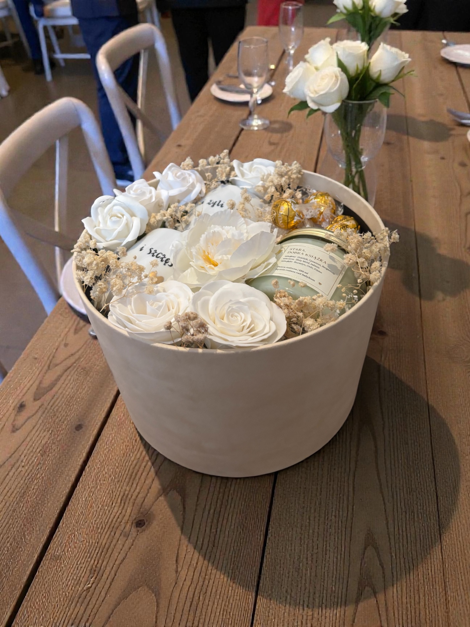 • dekoracje florystyczne – suszone i stabilizowane kwiaty, gipsówka i inne ozdoby, które nadają całości eleganckiego wyglądu
