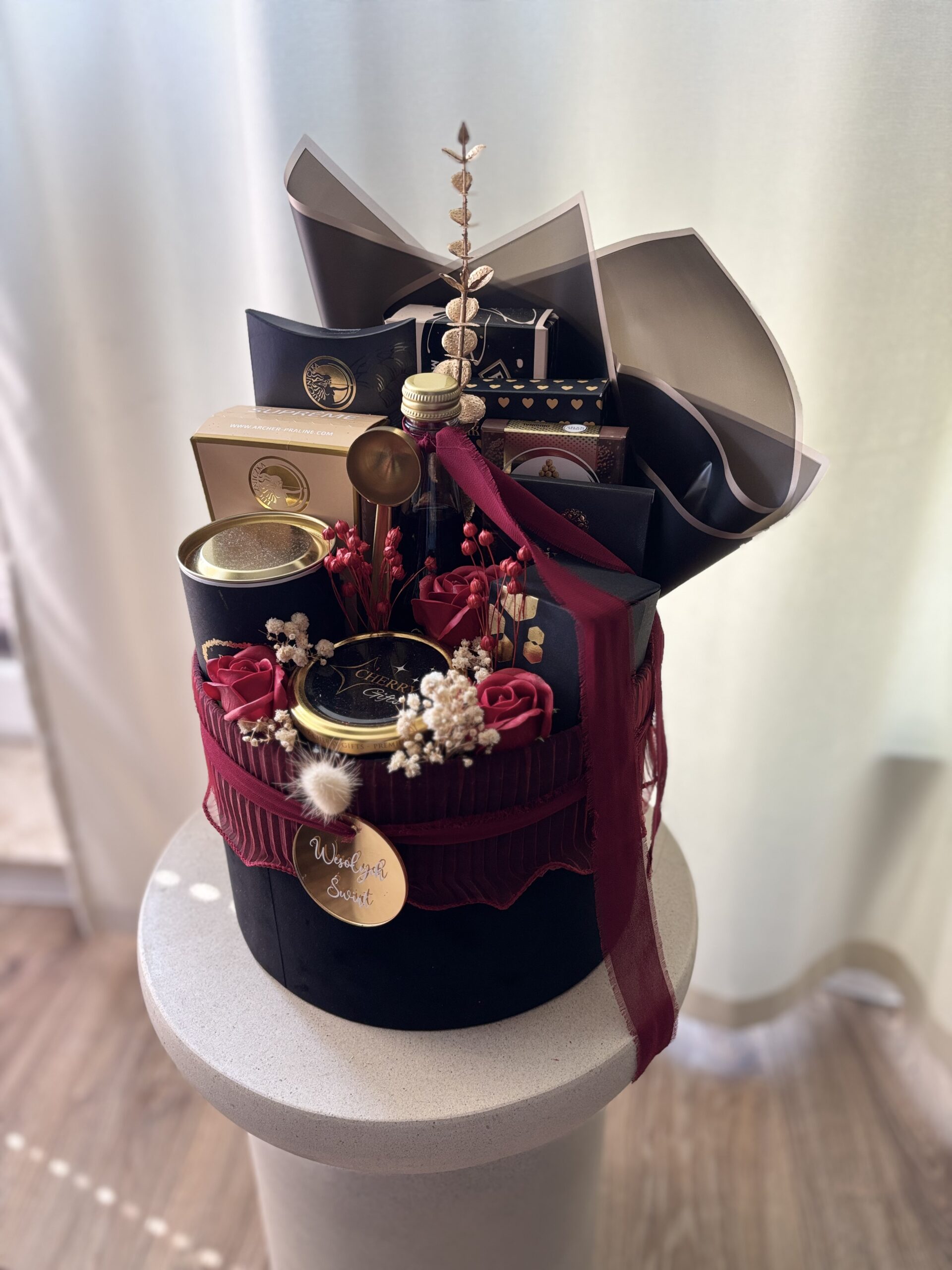 - dekoracje florystyczne – suszone i stabilizowane kwiaty, gipsówka i inne ozdoby, które nadają całości eleganckiego wyglądu